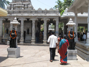 The ancient temple of Sri Sharada, the presiding deity of Sringeri has a glorious history that begins with the setting up of the Dakshinamnaya Peetham by Sri Shankara Bhagavatpada. Originally it was an unpretentious shrine with the Murti of Sharada made of sandalwood, installed over the Sri Chakra that Sri Adi Shankara carved on a rock. Subsequently Sri Bharati Krishna Tirtha and Sri Vidyaranya had a temple built in the Kerala style, with timber and tiled roof. Sri Bharati Krishna Tirtha substituted the sandalwood idol with the present golden idol.